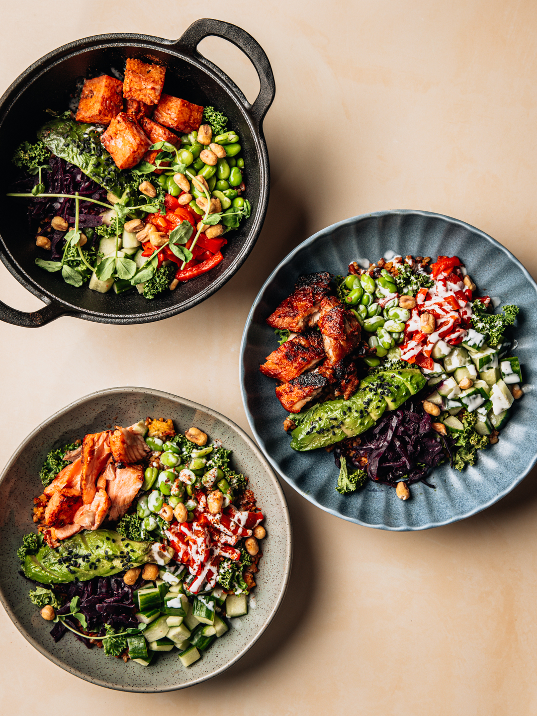 Chilled grains, charred peppers, kale, avocado, crispy corn, red cabbage and cucumber.